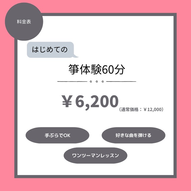 箏プランの魅力 1. マンツーマン指導 - 経験豊富な講師が一対一で指導するため、個々のペースに合わせたレッスンが受けられます。細かな指導や質問にも丁寧に対応し、安心して学べます。 2. パーソナライズドレッスン - 参加者のレベルや興味に合わせたオーダーメイドのレッスン内容を提供。アニメや話題の曲から選び、自分だけの特別な曲を演奏できます。 3. プロフェッショナルな環境 - 高品質な箏と設備が整った環境でのレッスン。演奏の際の音響効果や快適さを追求した空間で、より深く箏の音色を体感できます。 4. 演奏動画撮影 - レッスンの最後には、演奏動画の撮影が含まれます。美しい映像と音響で、自分の演奏を記念に残せます。 5. オリジナル楽譜プレゼント - レッスン中に使用したオリジナル楽譜や、箏に関する詳細なまとめプリントをお持ち帰りいただけます。さらに、箏の歴史まとめプリントと世界に1つだけのオリジナル楽譜をプレゼント プラン内容(一例:プランはやりたいことに対してカスタマイズ可能です♪) ウェルカム&自己紹介 (5分) ウェルカムドリンクをお楽しみいただきながら、リラックスした雰囲気で講師とお話ししていただきます。 この時間を使ってレッスンの流れやご期待について確認し、あなたにピッタリの体験を設計します。 箏の基本テクニックと歴史 (10分) 箏の魅力的な歴史に触れながら、その美しい構造と基本的な弾き方を学びます。初心者の方も、箏の世界への第一歩を確実に踏み出せるようにサポートします。 パーソナライズド演奏指導 (35分) あなたが選んだ曲を用いて、一対一での丁寧な演奏指導を行います。テクニックの微調整から表現の深化まで、個々のニーズに応じた細やかなアドバイスで、箏演奏の魅力を最大限に引き出します。 演奏動画撮影と質疑応答 (10分) はじめての箏体験の記念を動画撮影可能です。また、レッスン中に生じた疑問や質問に、専門的な知識を持つ講師が直接お答えします。 プランの特徴 - **完全個別指導:** 一人一人のペースに合わせたレッスンで、効率よく上達できます。 - **特別な体験:** 高品質な環境とプロのサポートで、特別な箏体験を提供します。 - **思い出作り:** 美しい演奏動画とオリジナル楽譜で、特別な思い出を残せます。 箏の深い音色を、特別な空間で、プロの指導とともに体感してみませんか?皆様のご参加を心よりお待ちしております。